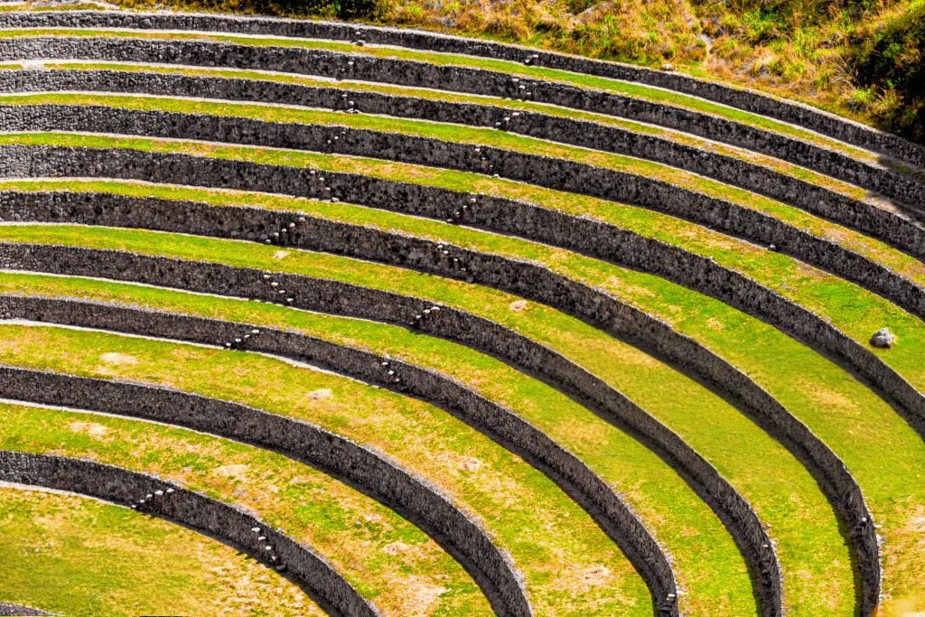 Explora las terrazas circulares de experimentación agrícola.